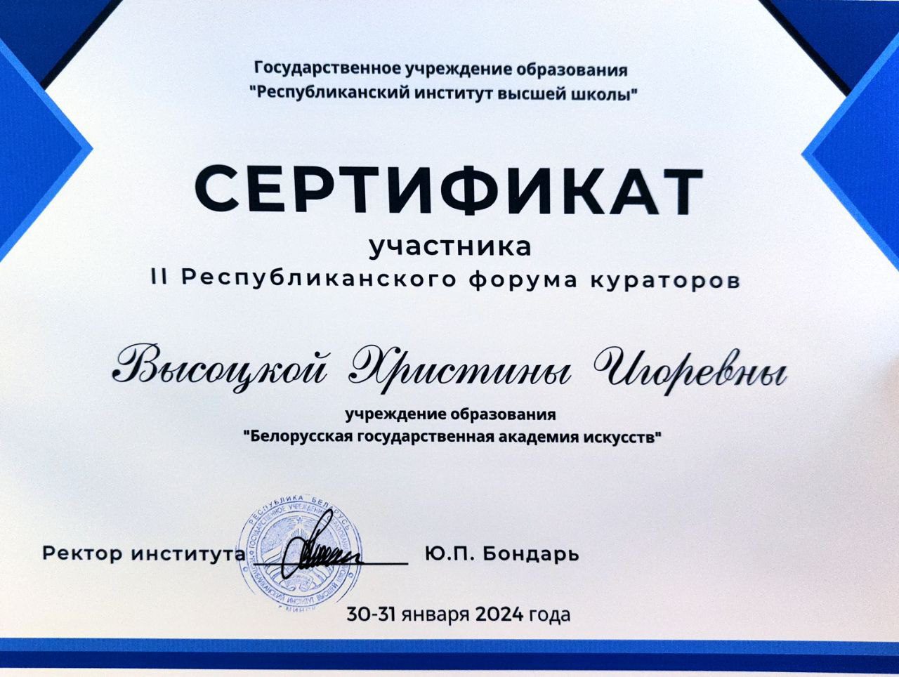 Сегодня 31 января 2024 в Национальном детском технопарке были подведены итоги Второго республиканского форума кураторов учебных групп учреждений высшего образования. В форуме участвуют более 160 кураторов вузов Беларуси. Белорусскую государственную академию искусств представляет доцент кафедры ДПИ и костюма Х.И. Высоцкая.