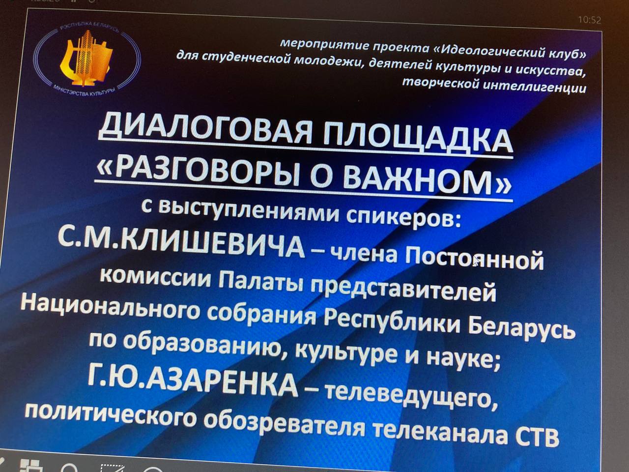 Диалоговая площадка проведена в рамках проекта «Идеологический клуб» Министерства культуры Республики Беларусь для студенческой молодежи, деятелей культуры и искусства, творческойДалее