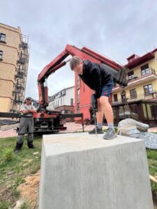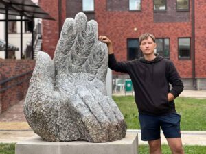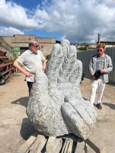 Первая скульптура «Руки, которые кормят». Материал исполнения: гранит. Автор: Иван Кирдун, студент 5 курса художественного факультета кафедры «Скульптура» Академии искусств 2. Вторая скульптура «Белорусский зодчий». Материал: гранит. Автор: Даниил Бирюков, также студент 5 курса художественного факультета кафедры «Скульптура» Академии искусств.