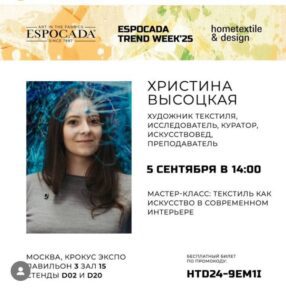 5 сентября доцент кафедры декоративно-прикладного искусства и костюма Высоцкая Христина Игоревна проведет авторский мастер-класс “Текстиль как искусство в современном интерьере” на престижном профессиональном форуме в рамках выставки Espocada Trend Week. Компания Espocada является ведущим производителем в России и странах СНГ интерьерного текстиля высокого класса.