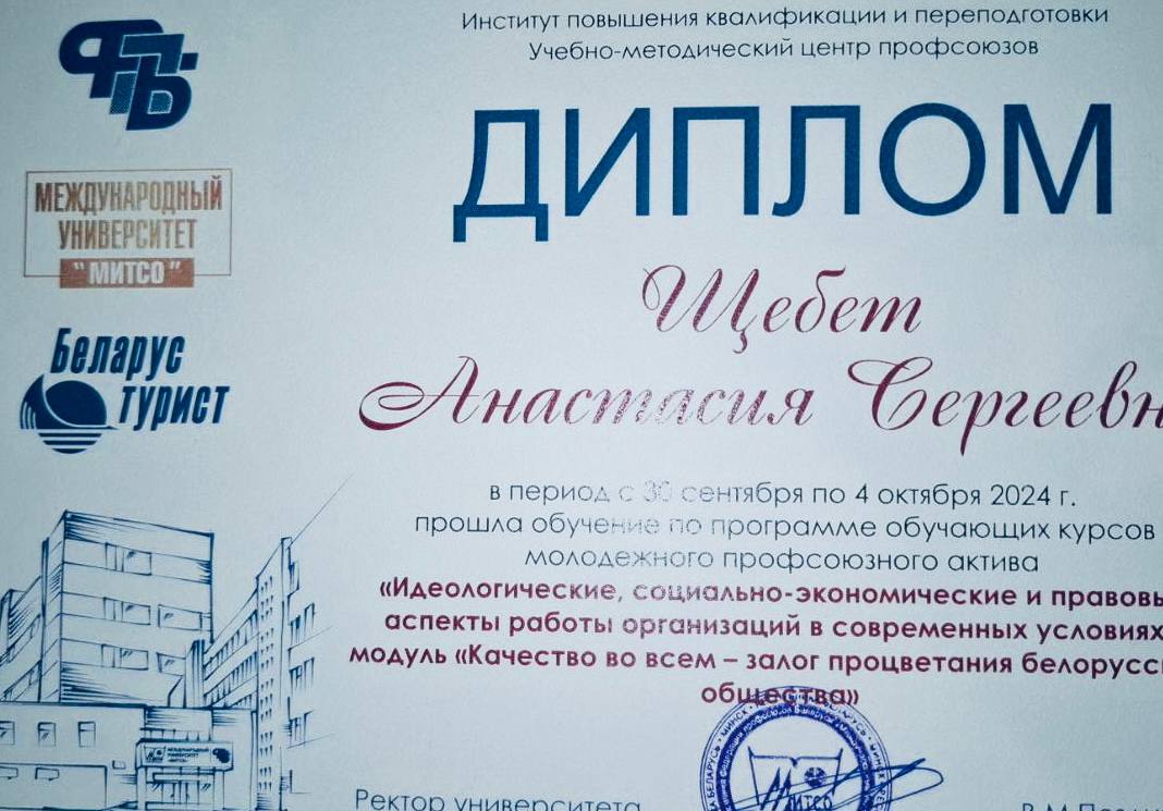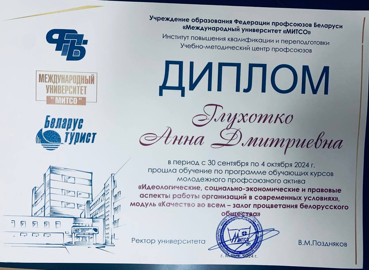 Поздравляем Глухотко Анну, студентку 2 курса факультета экранных искусств и Щебет Анастасию, студентку 5 курса факультета дизайна и декоративно-прикладного искусства, с получением дипломов об окончании профсоюзных курсов молодежного актива в ДО «Логойский».