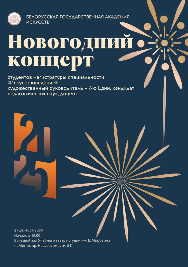 Новогодний концерт студентов магистратуры специальности «Искусствоведение» 27 декабря 2024 Художественный руководитель — Лю Цзин, кандидат педагогических наук, доцент