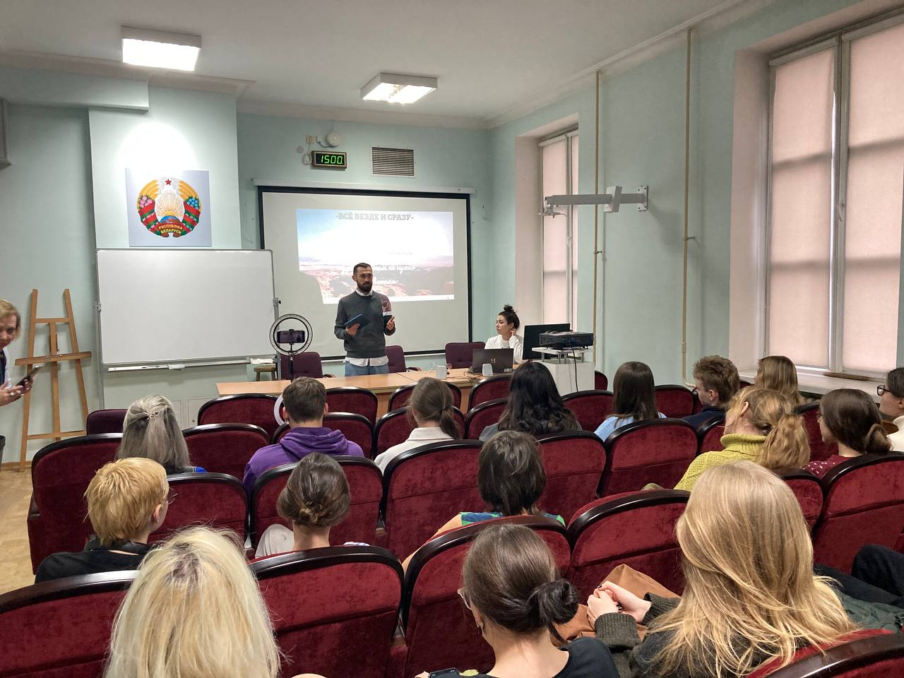 Рассказал о тонкостях работы на сьемочной площадке. Олег Стручков работал на таких проектах, как «Измены на ТНТ», «Небесная тропа», где установил мировой рекорд по самой высокогорной сьемке, проект «Дарвин», где в главной роли снялся Том Фэлтон. Практически и теоретически были разобраны тонкости профессии скрипт-супервайзера. Студенты получили ответы на интересующие их вопросы.