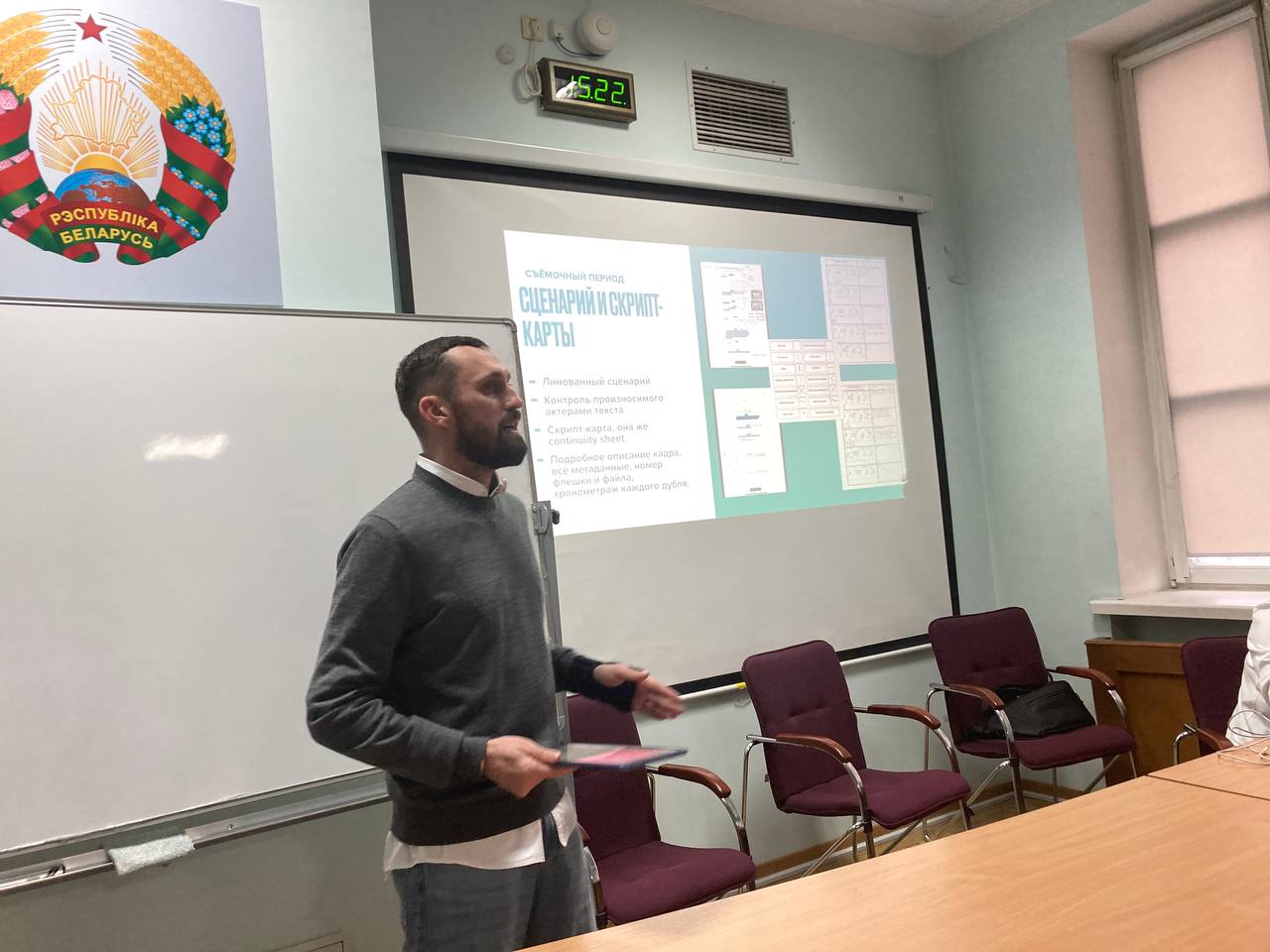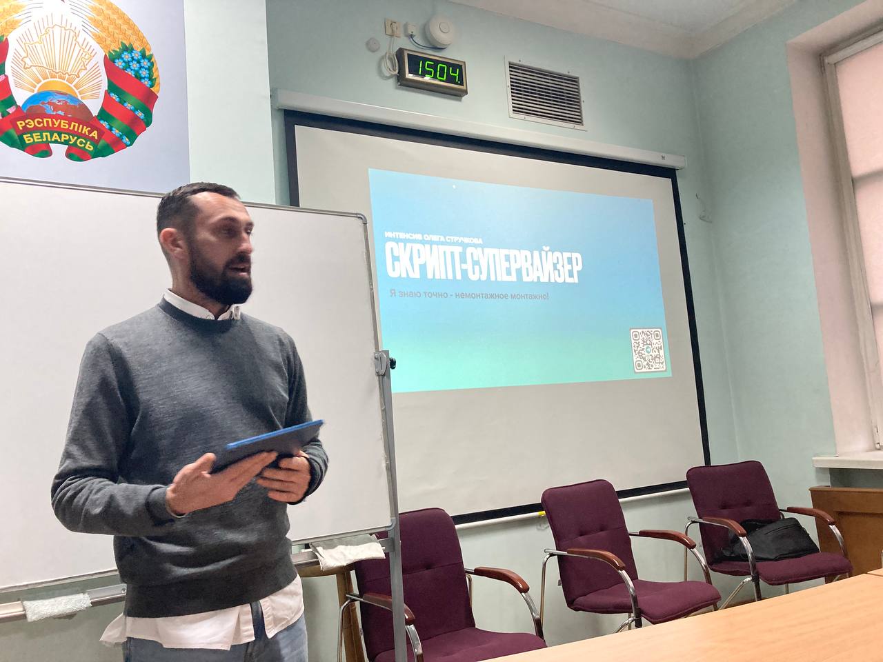 Рассказал о тонкостях работы на сьемочной площадке. Олег Стручков работал на таких проектах, как «Измены на ТНТ», «Небесная тропа», где установил мировой рекорд по самой высокогорной сьемке, проект «Дарвин», где в главной роли снялся Том Фэлтон. Практически и теоретически были разобраны тонкости профессии скрипт-супервайзера. Студенты получили ответы на интересующие их вопросы.