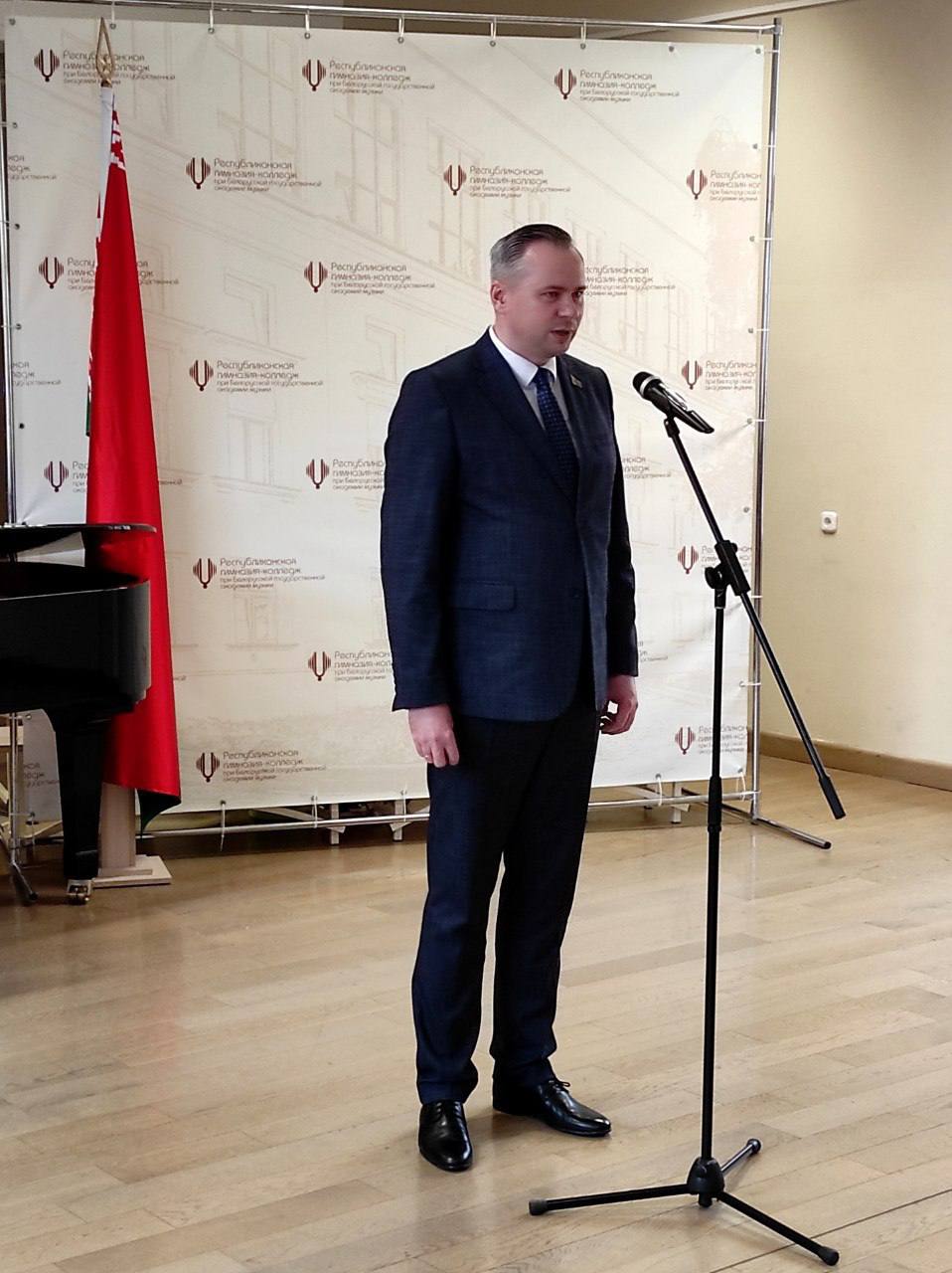 Первый заместитель министра культуры Республики Беларусь Дмитрий Геннадьевич Шляхтин вручил Благодарности Министерства культуры студентам Академии искусств: Марине Анищик, Александре Авдошко и Диане Гончаровой.