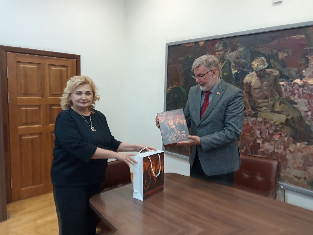 Наталья Кузнецова поблагодарила за участие в инициативе, а также вручила памятный подарок – годичный комплект журналов «Мастацтва» с изображением «живых картин», анимацию к которым делали студенты Белорусской государственной академии искусств. Также был передан набор открыток с «живыми картинами» и аналогичный буклет.