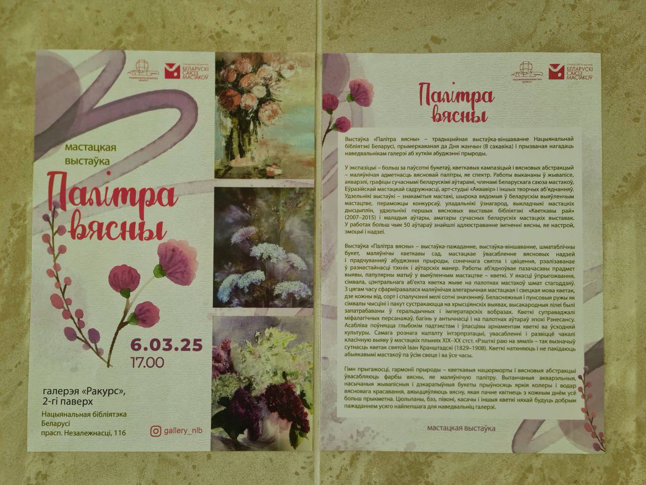 Выставка «Палитра весны», приуроченная к Международному женскому дню, открылась в Национальной библиотеке Беларуси 6 марта 2025 года в галерее «Ракурс».