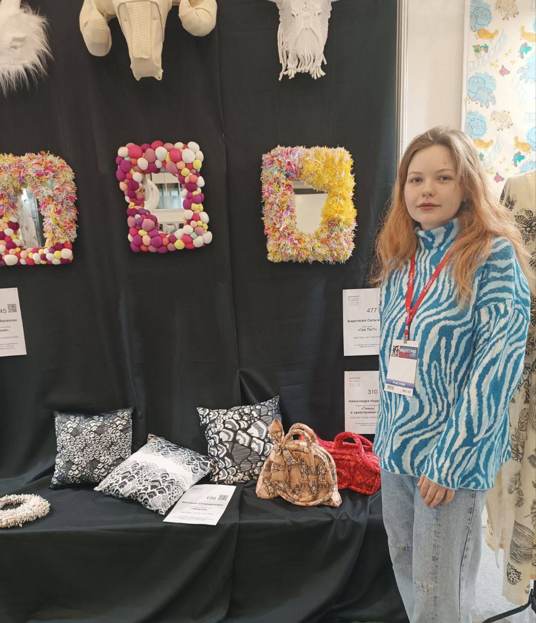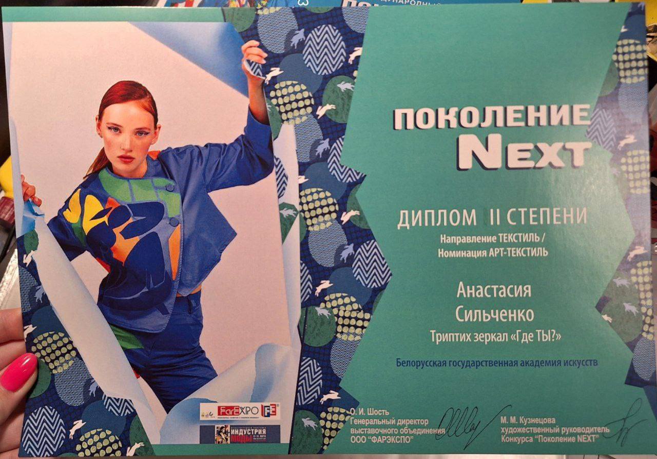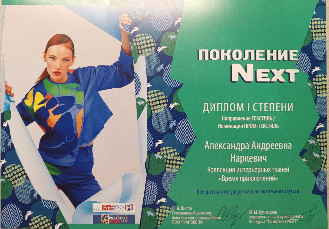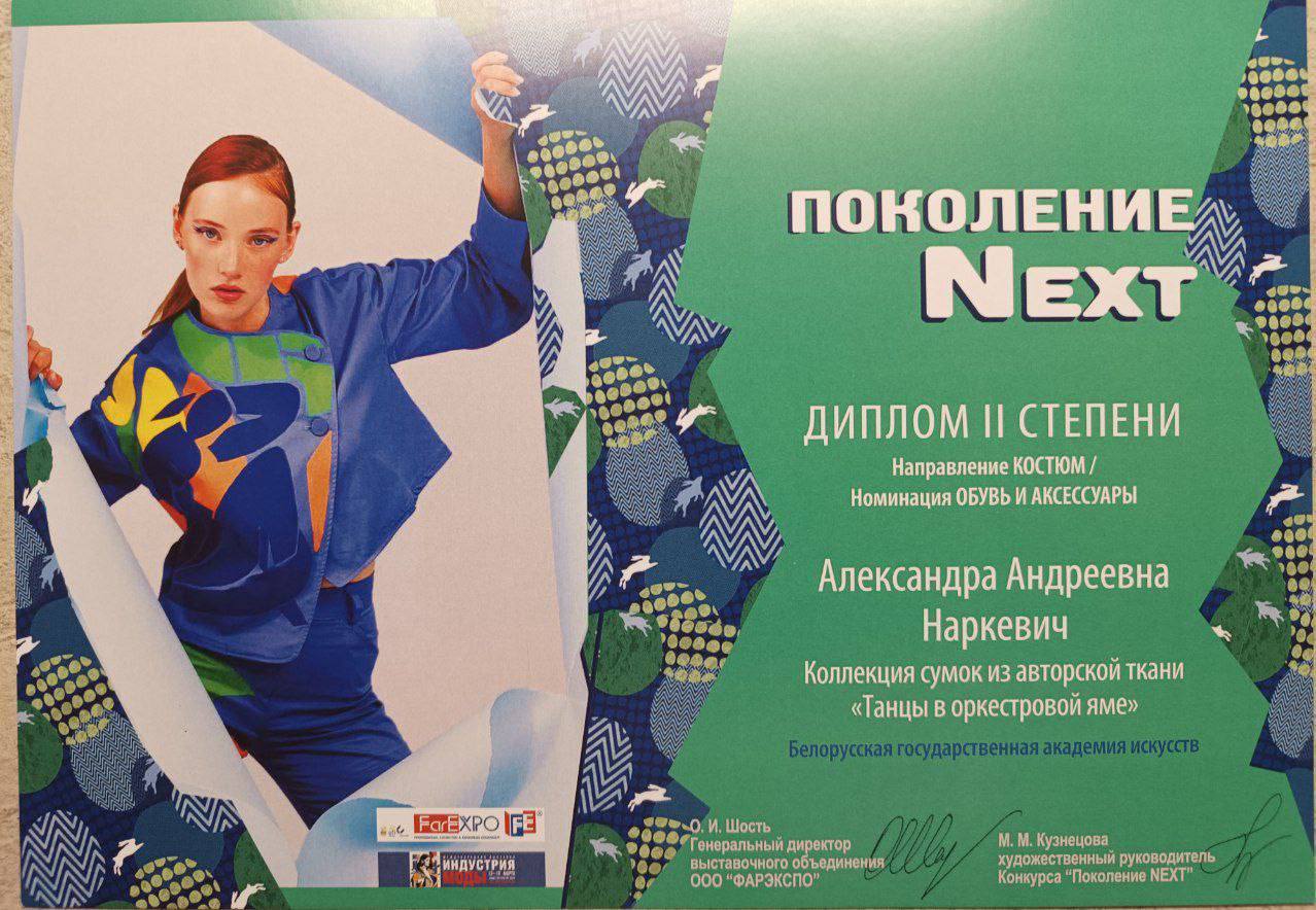 Александра Наркевич стала обладателем 1 места в номинации «Пром-текстиль»и 2 места в номинации «Обувь и аксессуары», Анастасия Сильченко стала обладателем 2 места в номинации «Арт-текстиль». Руководитель: доцент кафедры ДПИ и костюма Х.И.Высоцкая