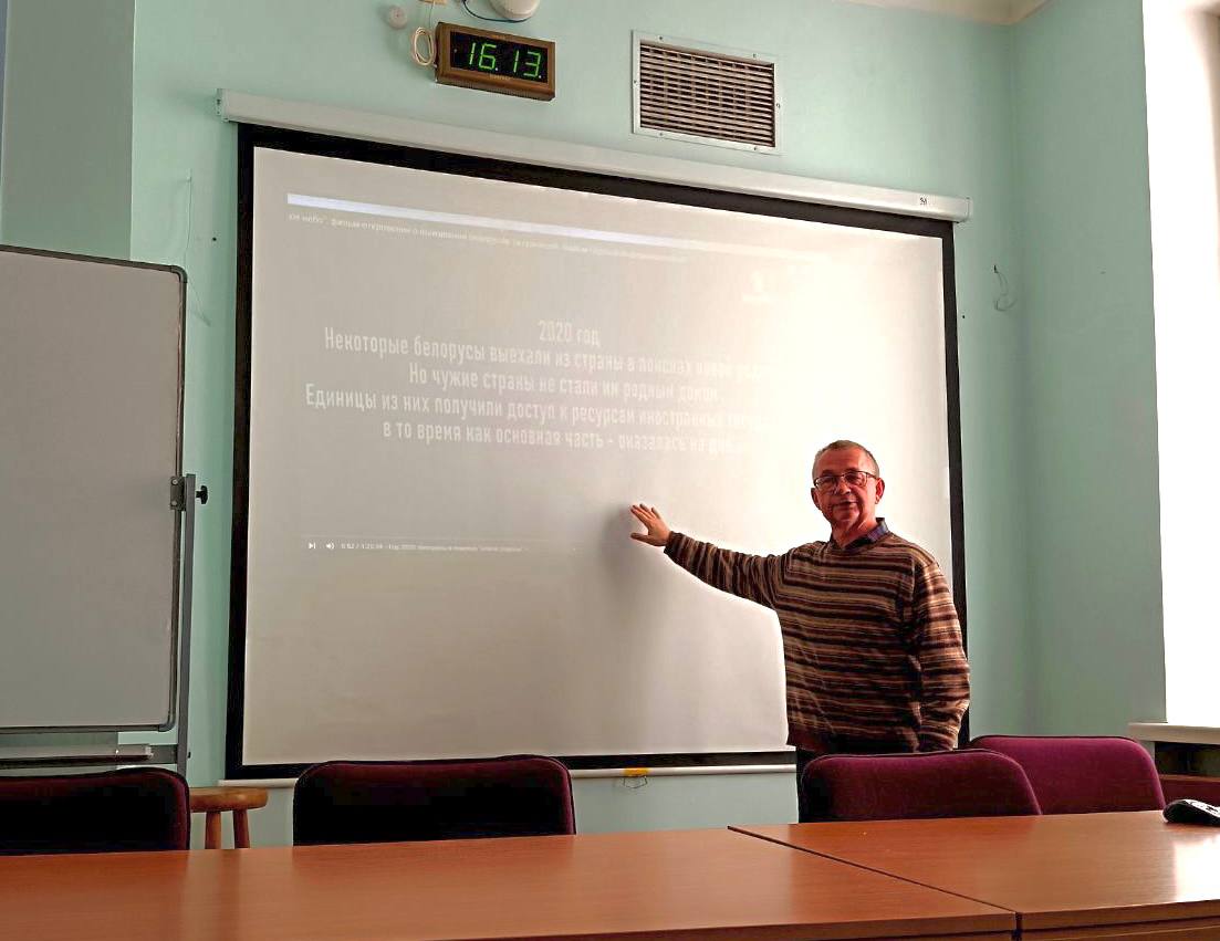 В начале просмотра декан Геннадий Лаврецкий обозначил проблематику и цель фильма, акцентировал внимание присутствующих на том, что события, в нем отраженные, основаны на реальных историях белорусов, на их откровениях о жизни за рубежом после событий 2020 года.