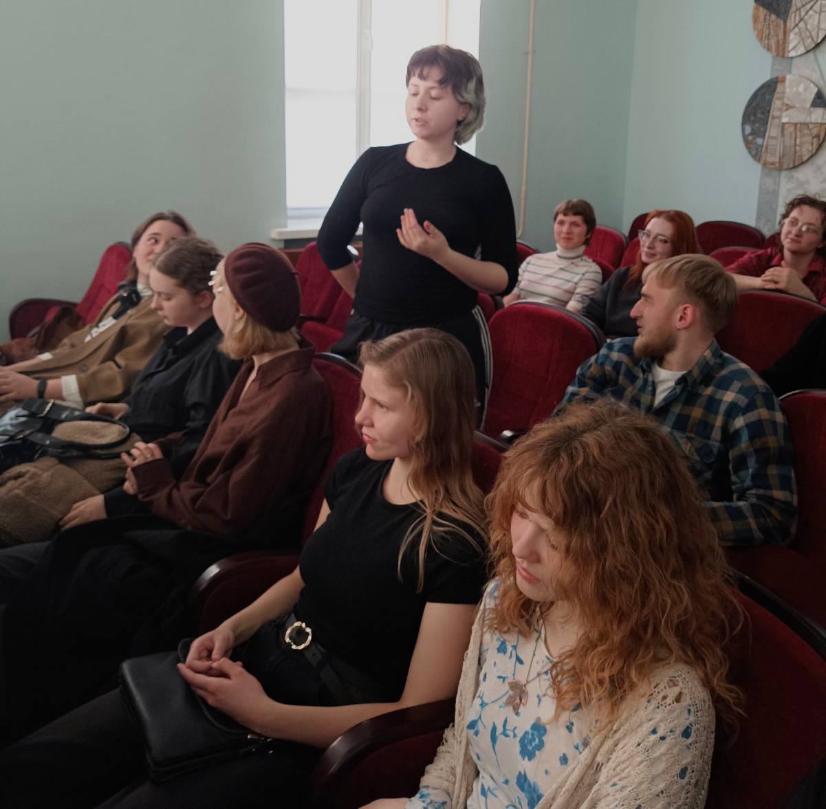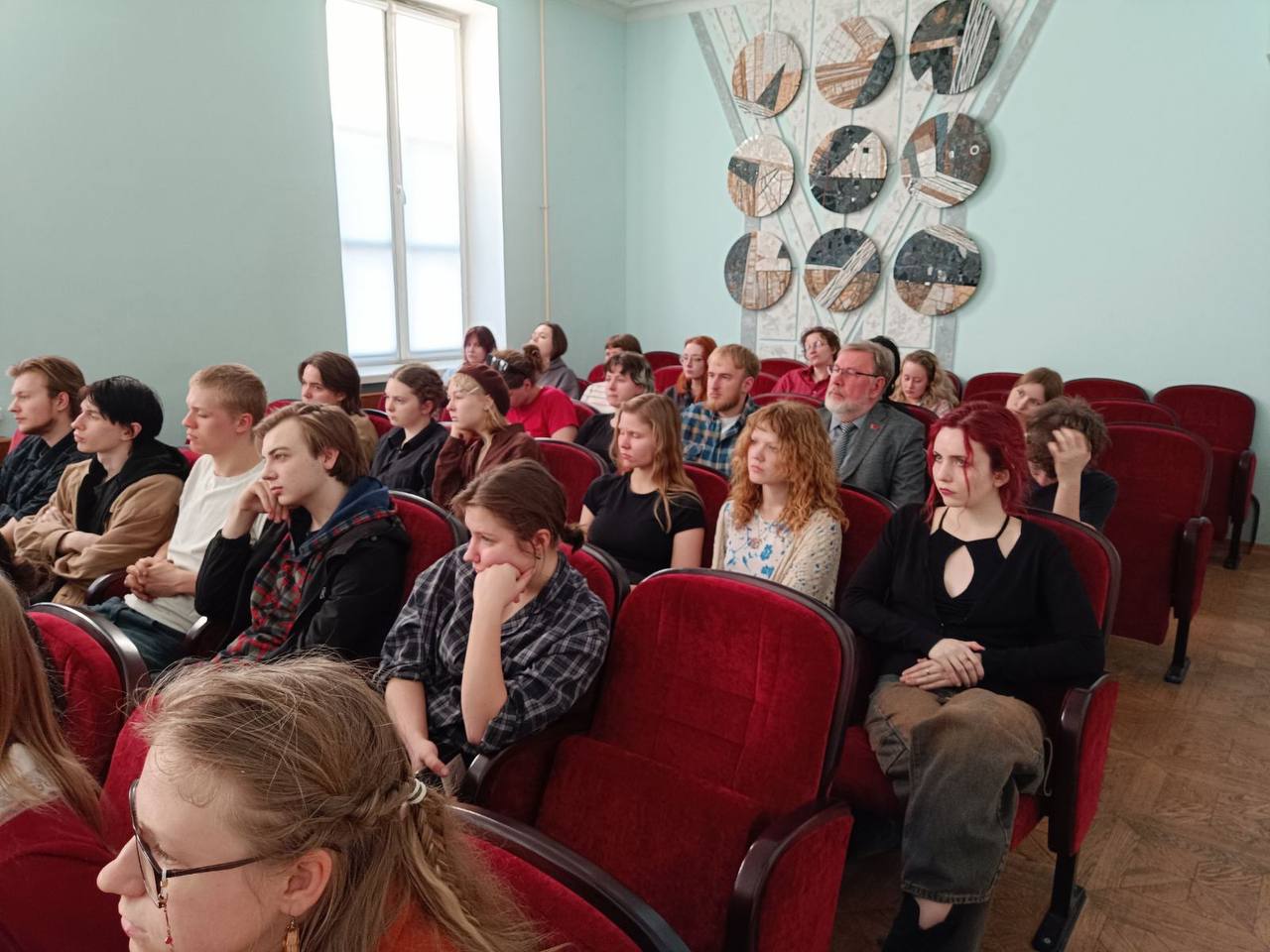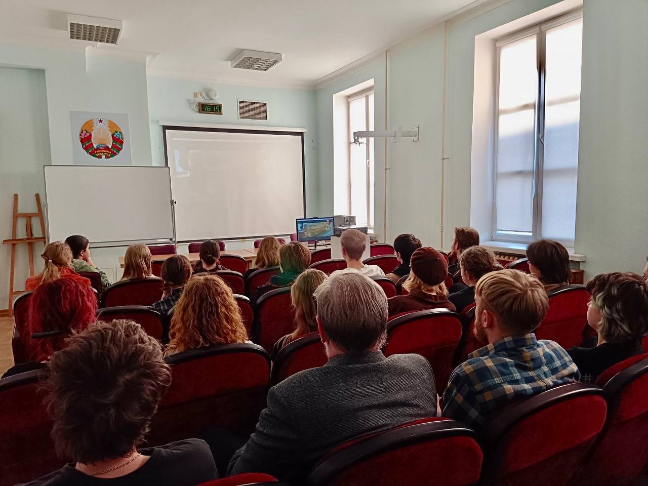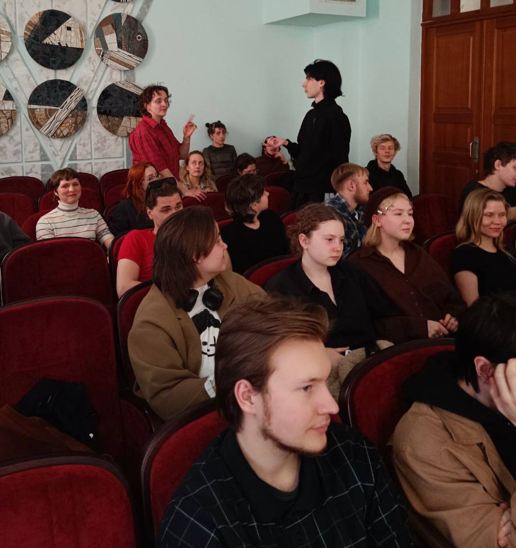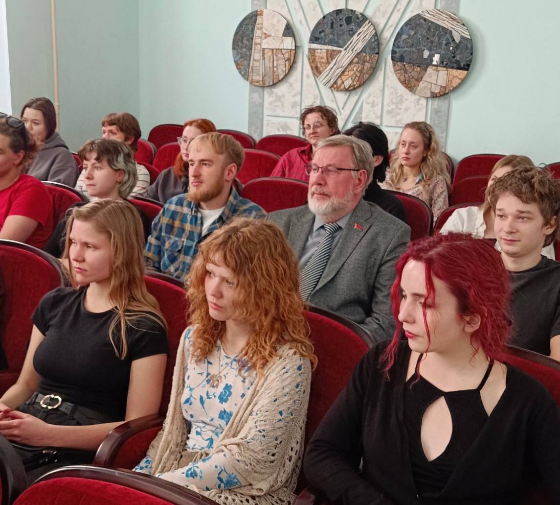 К совместному просмотру с последующим обсуждением присоединился ректор БГАИ Михаил Борозна, декан художественного факультета Геннадий Лаврецкий, студенты разных курсов и специальностей факультета.