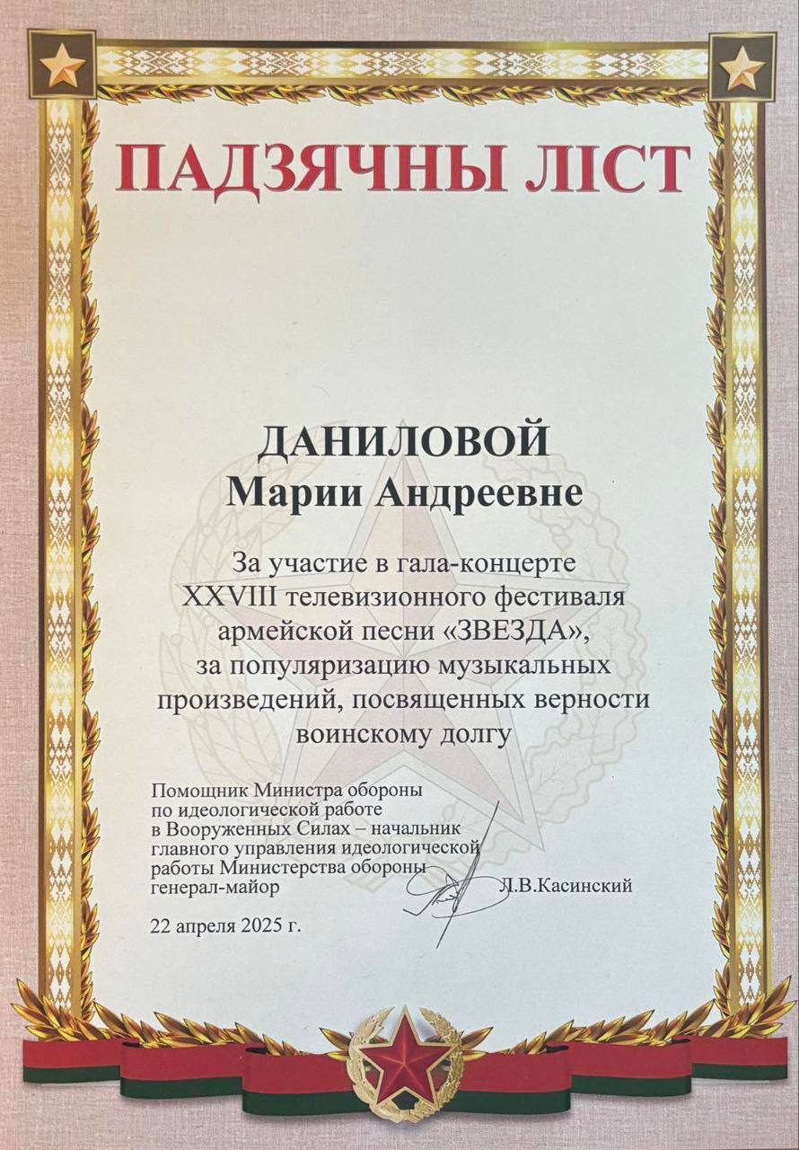 22 апреля студентка 2 курса театрального факультета специальности «Актерское искусство (музыкальный театр)» Белорусской государственной академии искусств Данилова Мария приняла участие в гала-концерте XXVIII телевизионного фестиваля армейской песни «ЗВЕЗДА»