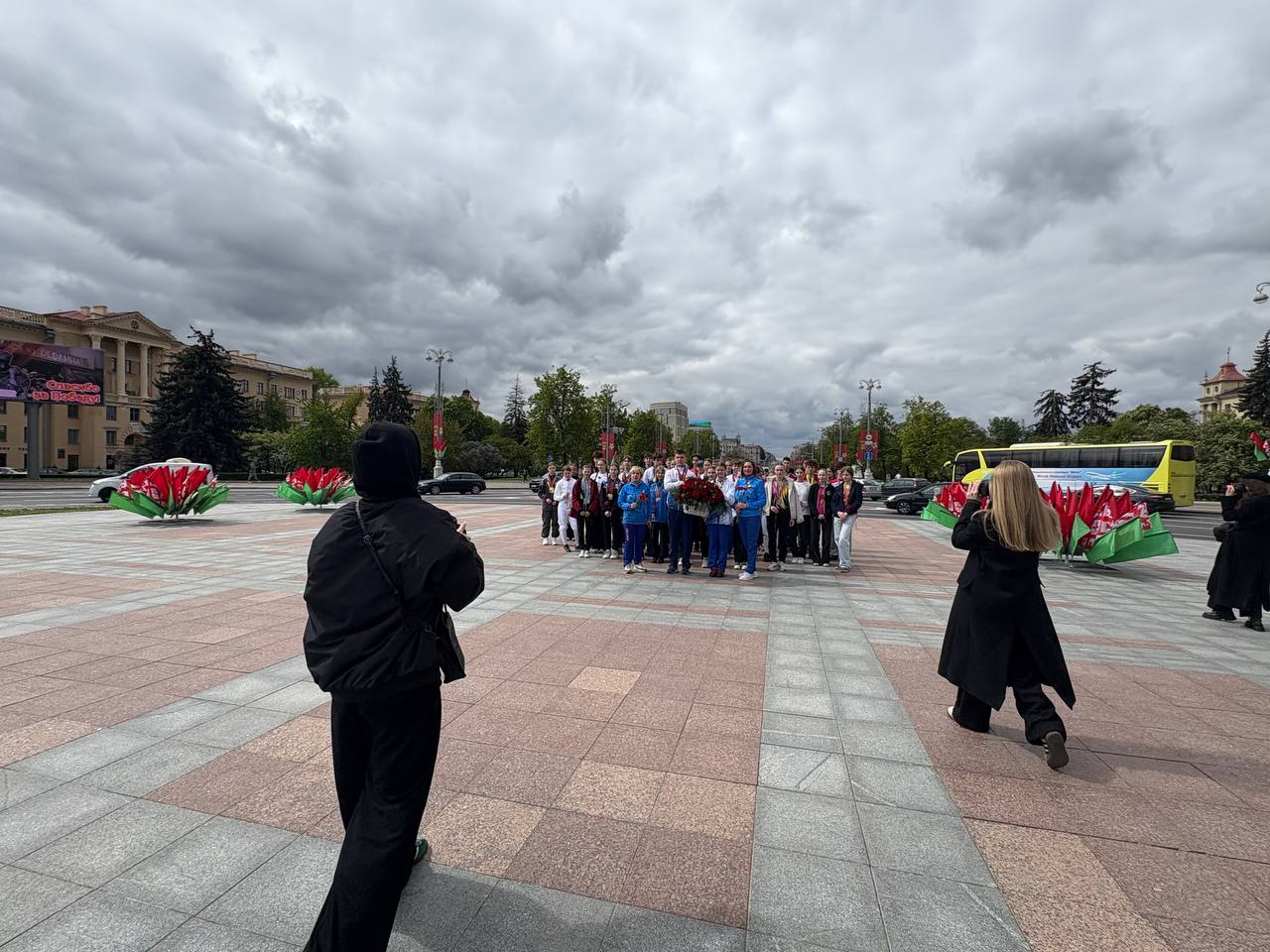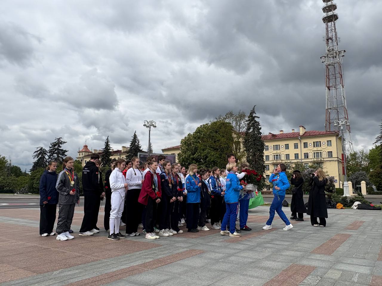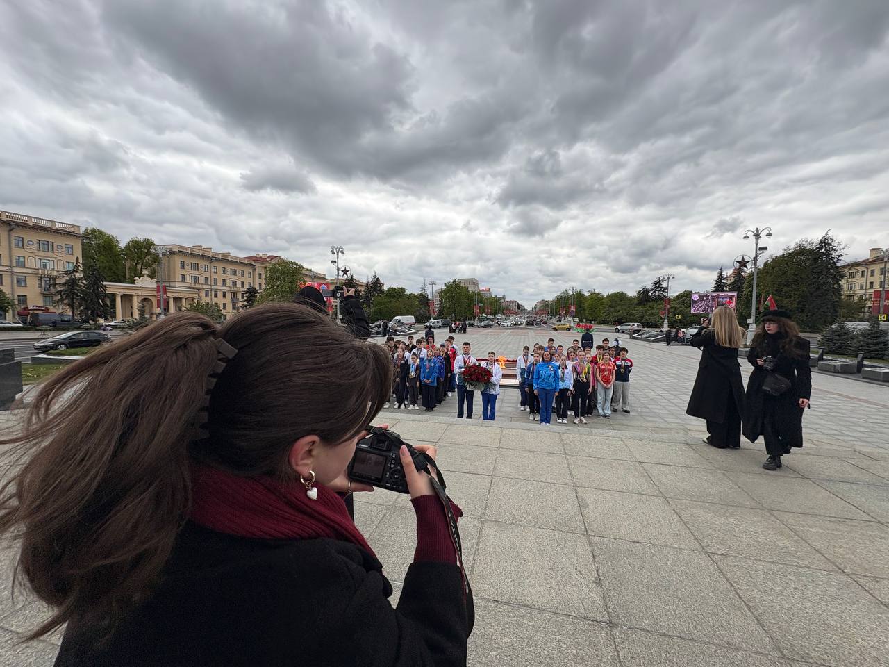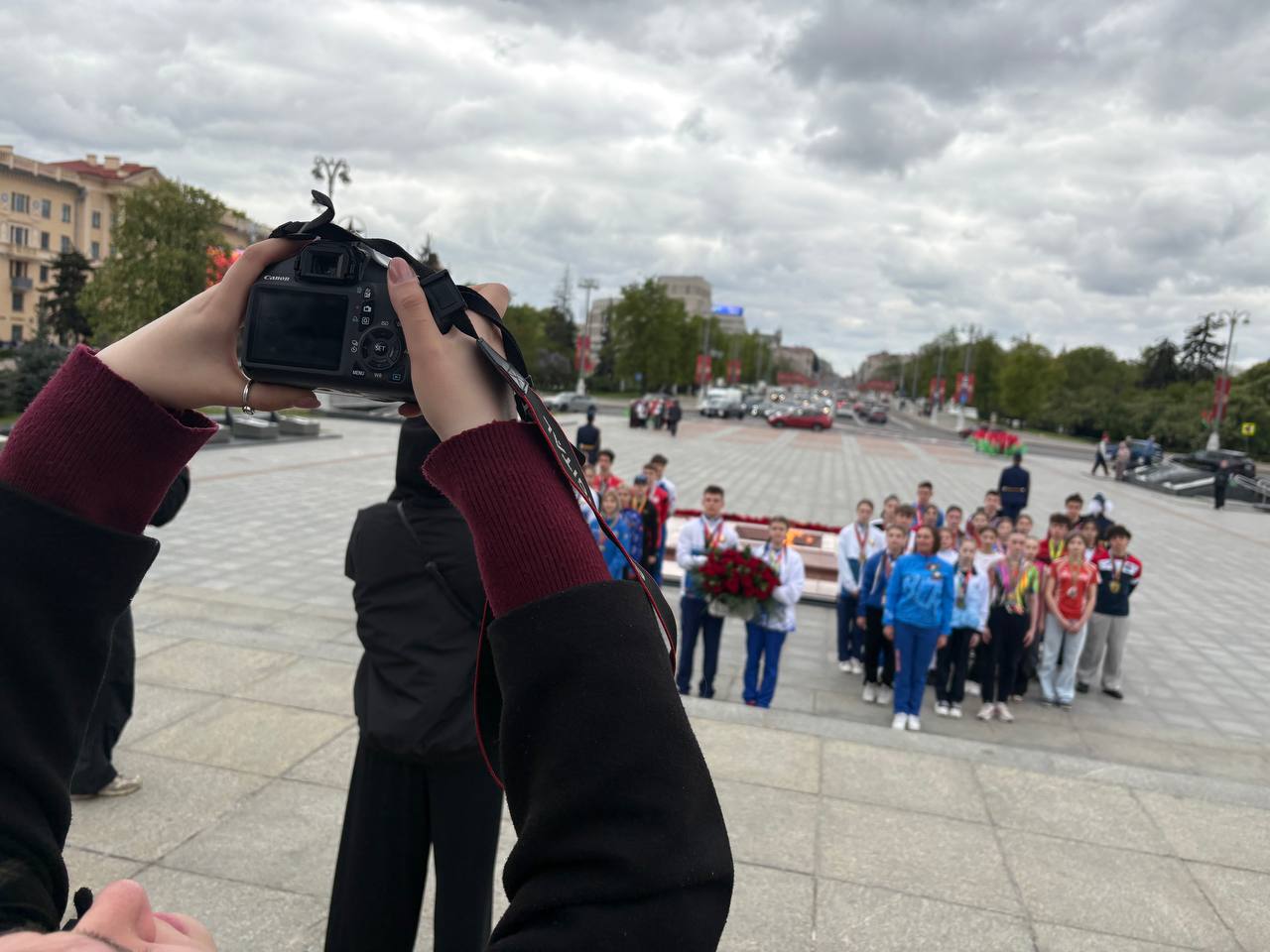 8 мая 2025 года студенты 4 курса направления специальности «Фотографика» на фотосъемке торжественного возложения цветов к Монументу Победы юными успешными спортсменами Беларуси.