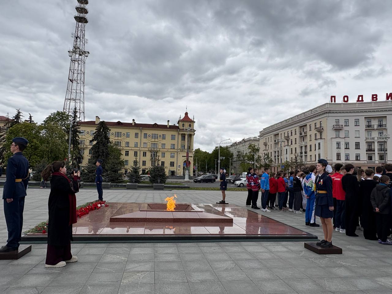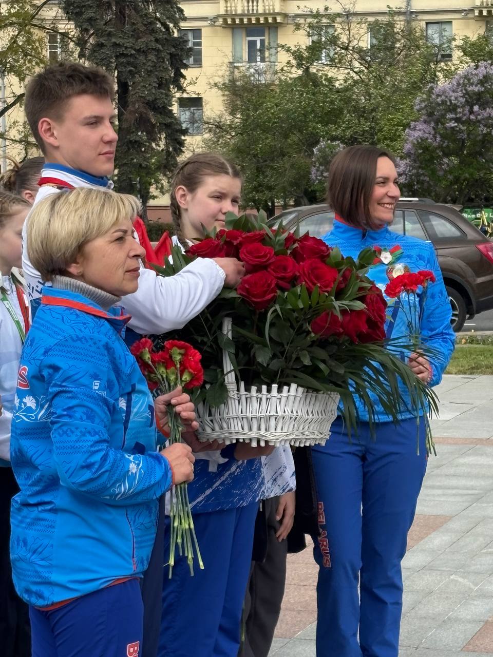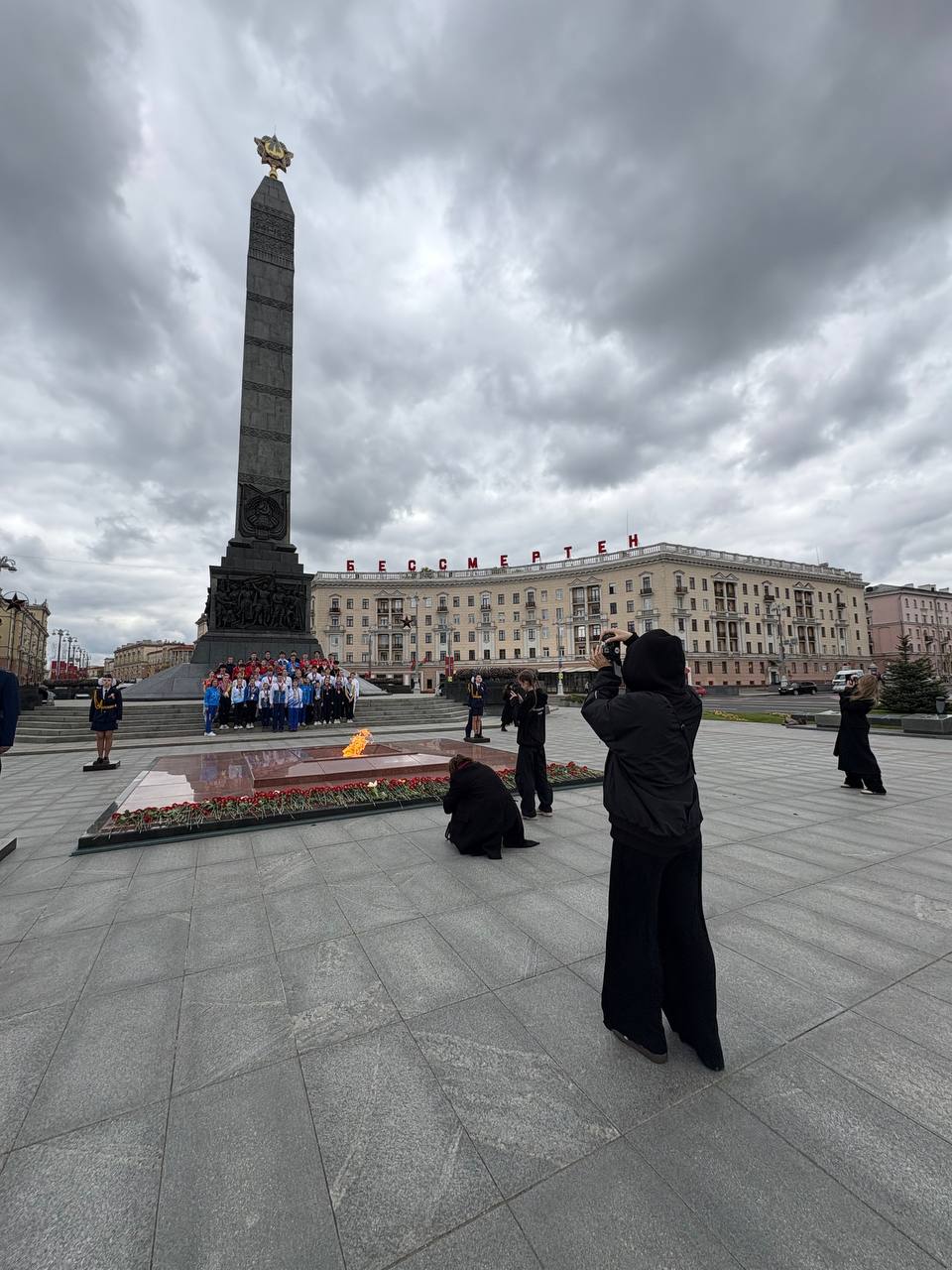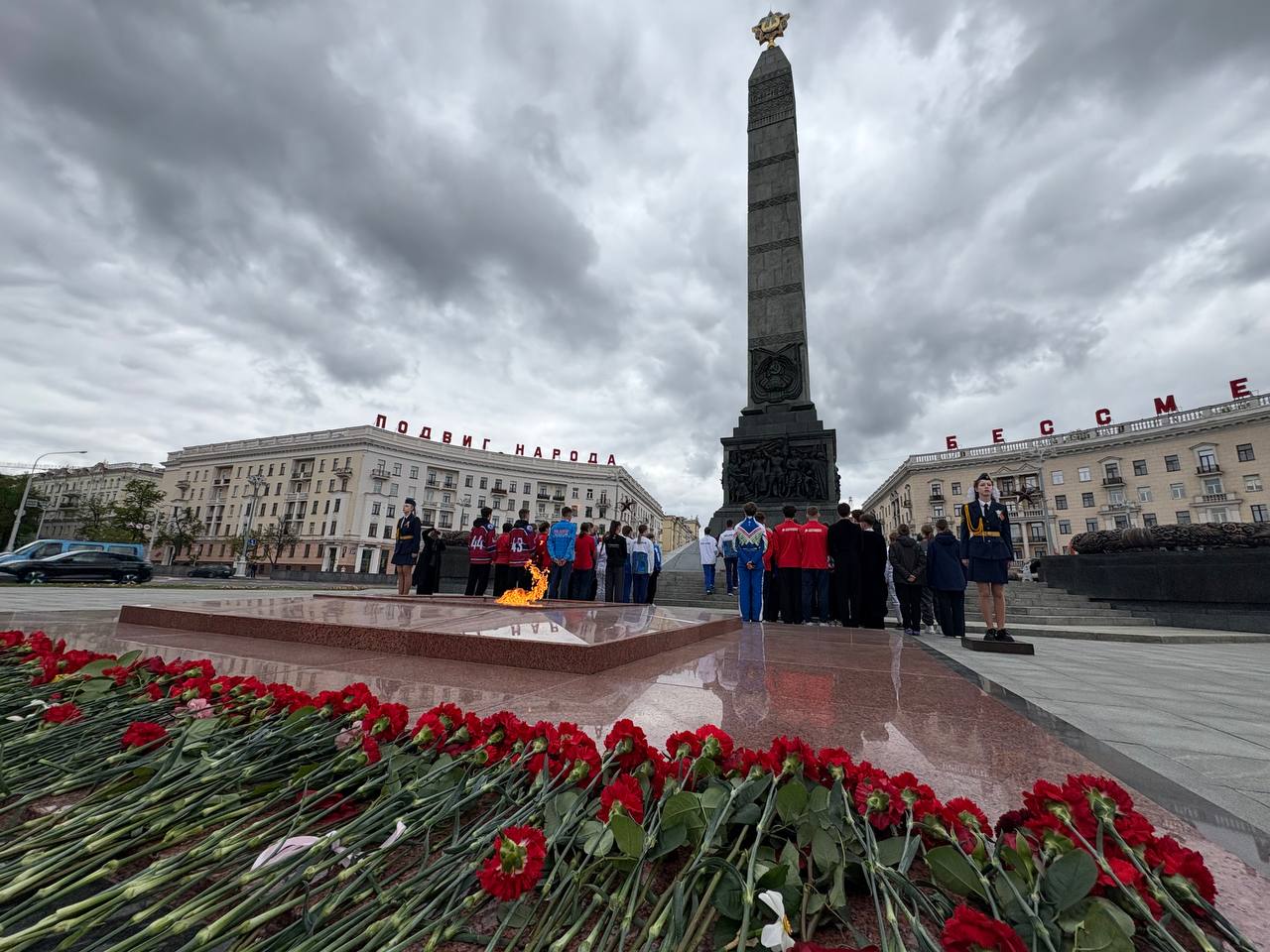 8 мая 2025 года студенты 4 курса направления специальности «Фотографика» на фотосъемке торжественного возложения цветов к Монументу Победы юными успешными спортсменами Беларуси.