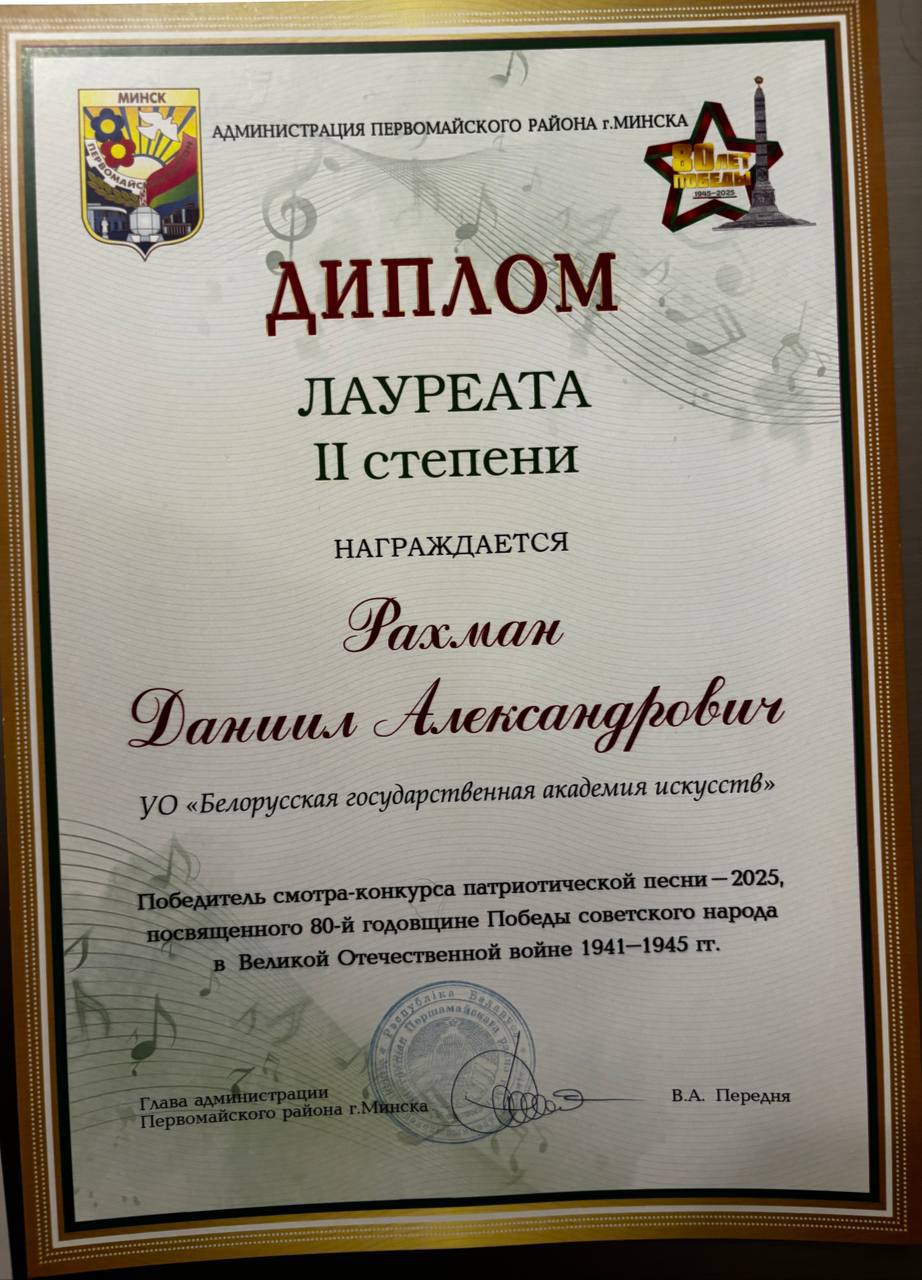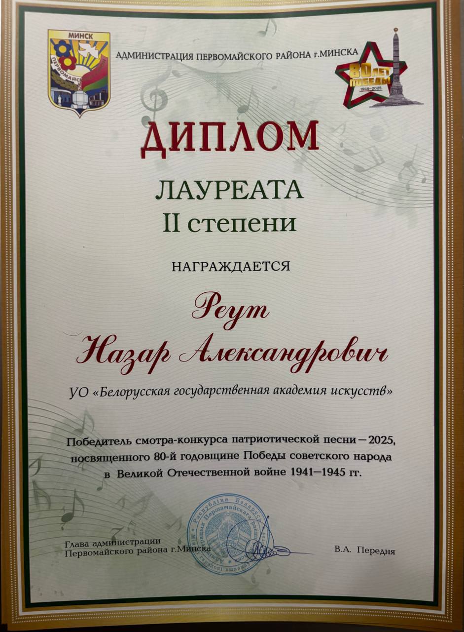 Поздравляем Назара Реута, студента 3 курса театрального факультета направления специальности «Актерское искусство (драматический театр и кино)» и Даниила Рахмана, студента 3 курса ТФ направления специальности «Режиссура театра ( эстрада)» с дипломами II степени за Победу в районном смотре-конкурсе патриотической песни, посвященном 80-й годовщине Победы советского района в Великой Отечественной войне 1941-1945 гг.