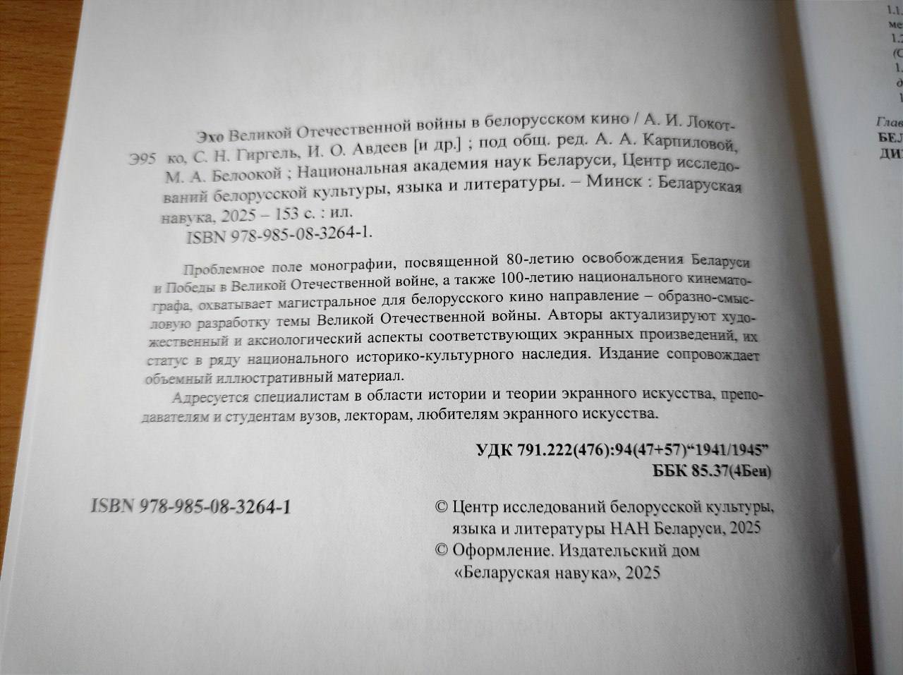 В юбилейный и памятный год 80-летия Великой Победы в Национальной академии наук Беларуси издана коллективная монография «Эхо Великой Отечественной войны в белорусском кино», в которой авторами научных статей выступили педагоги факультета экранных искусств О.Медведева, О.Сильванович и студент 2 курса специальности «Кинотеледраматургия» М.Логвиненко.