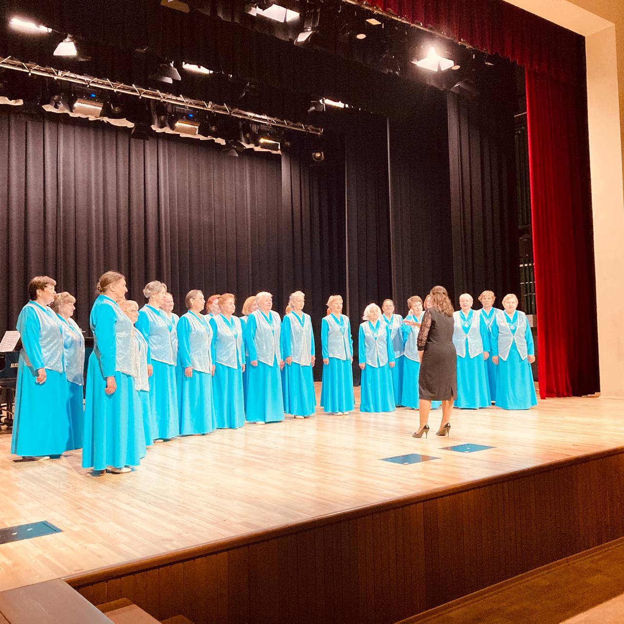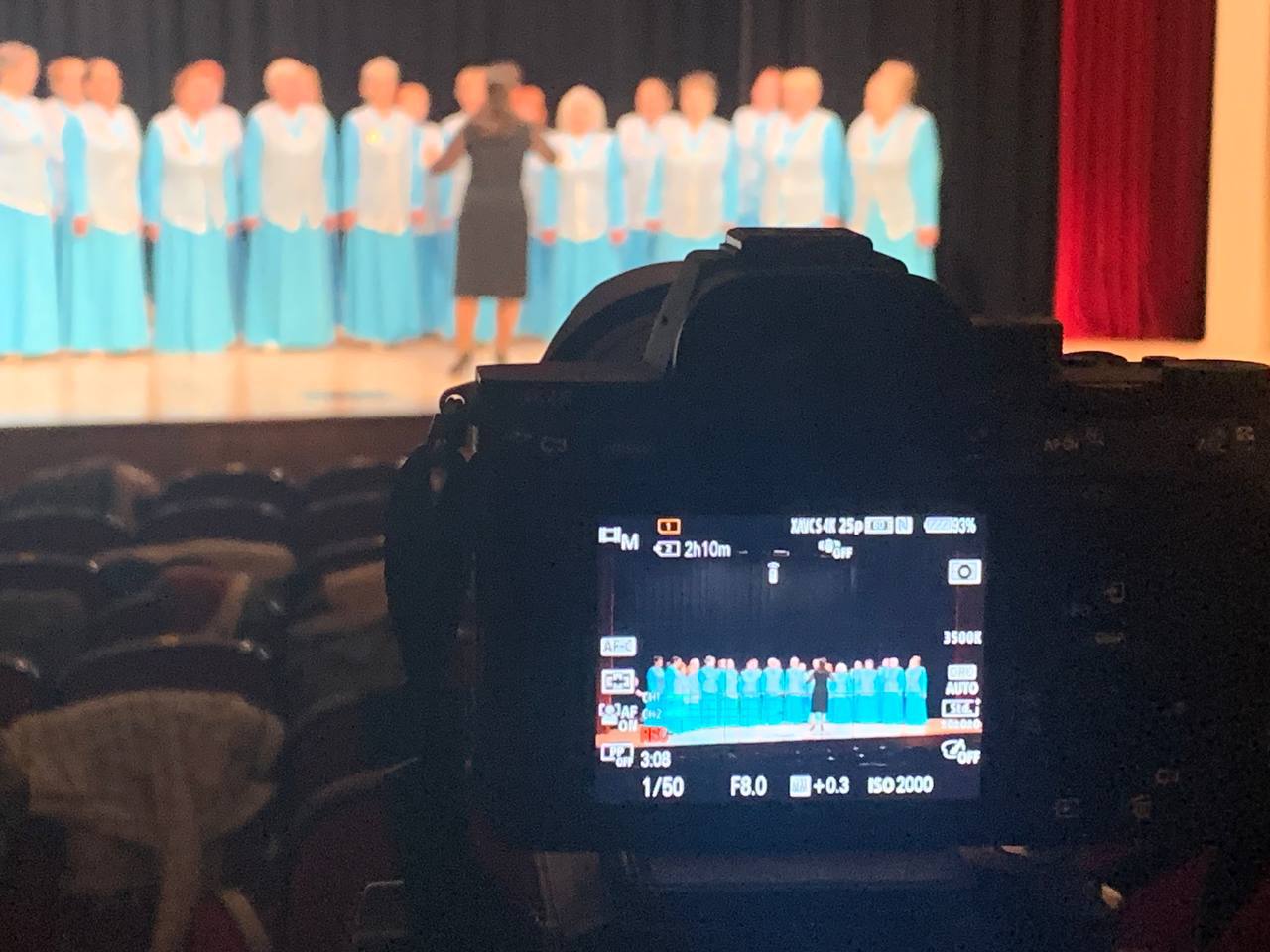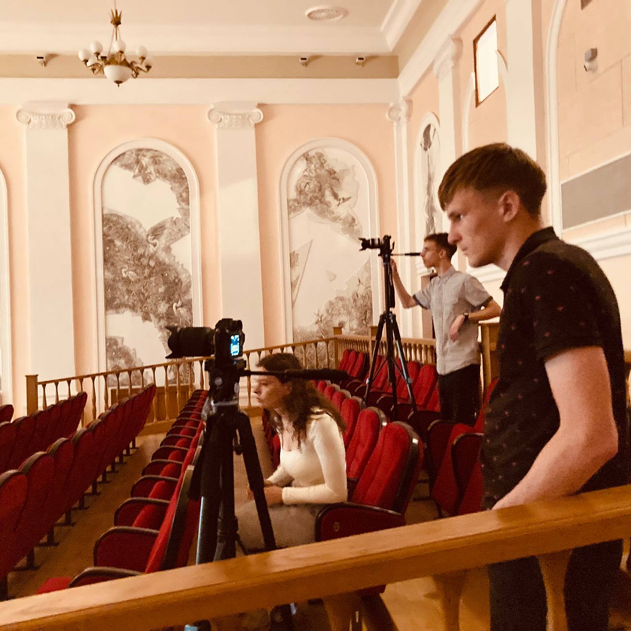 Съемки курсовой работы (клипа) в рамках экзаменационной сессии студентами 2 курса направления специальности «Режиссура аудиовизуального произведения» и «Телеоператорство» факультета экранных искусств БГАИ по предмету «Мастерство режиссера» с участием народного хора ветеранов «Спадчына» на сцене большого зала учебного театра-студии имени Е. Мировича.