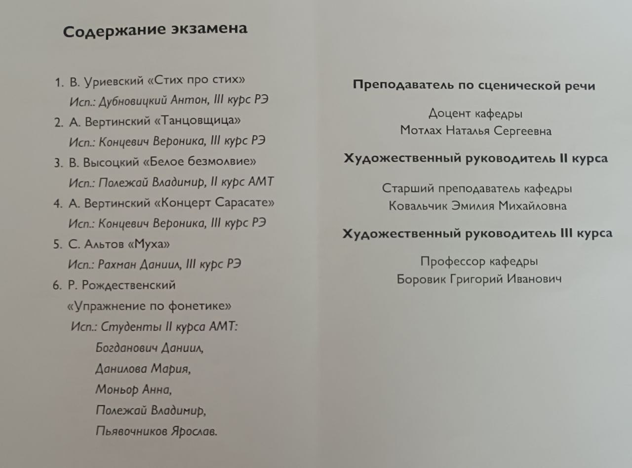 9 июня студенты 2 курса специальности «Актерское искусство музыкального театра» и 3 курса специальности «Режиссура театра (эстрада)», в рамках «Экзаменационного просмотра» представили работу по дисциплине «Сценическая речь», под руководством доцента кафедры сценической речи, вокала и пластических дисциплин Мотлах Натальи Сергеевны.