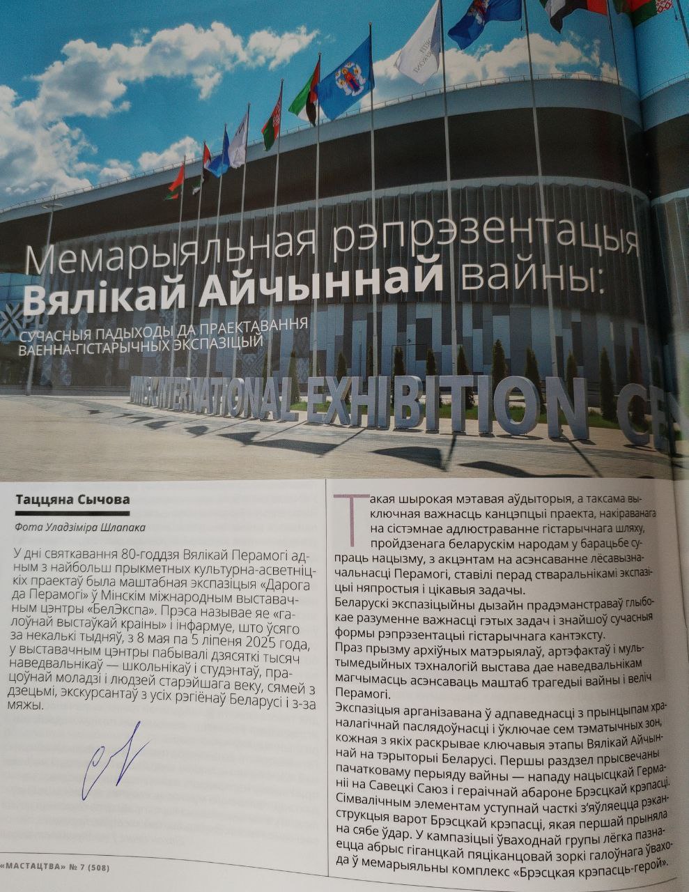 Июльский номер журнала «Мастацтва» представляет экспертный взгляд зав. кафедрой промышленного дизайна и интерьера Сычевой Т. П. на организацию и оформление экспозиции «Дарога да Перамогі», которую с 8 мая по 5 июля 2025 года в Минском международном выставочном центре «БелЭкспо» увидели десятки тысяч посетителей.
