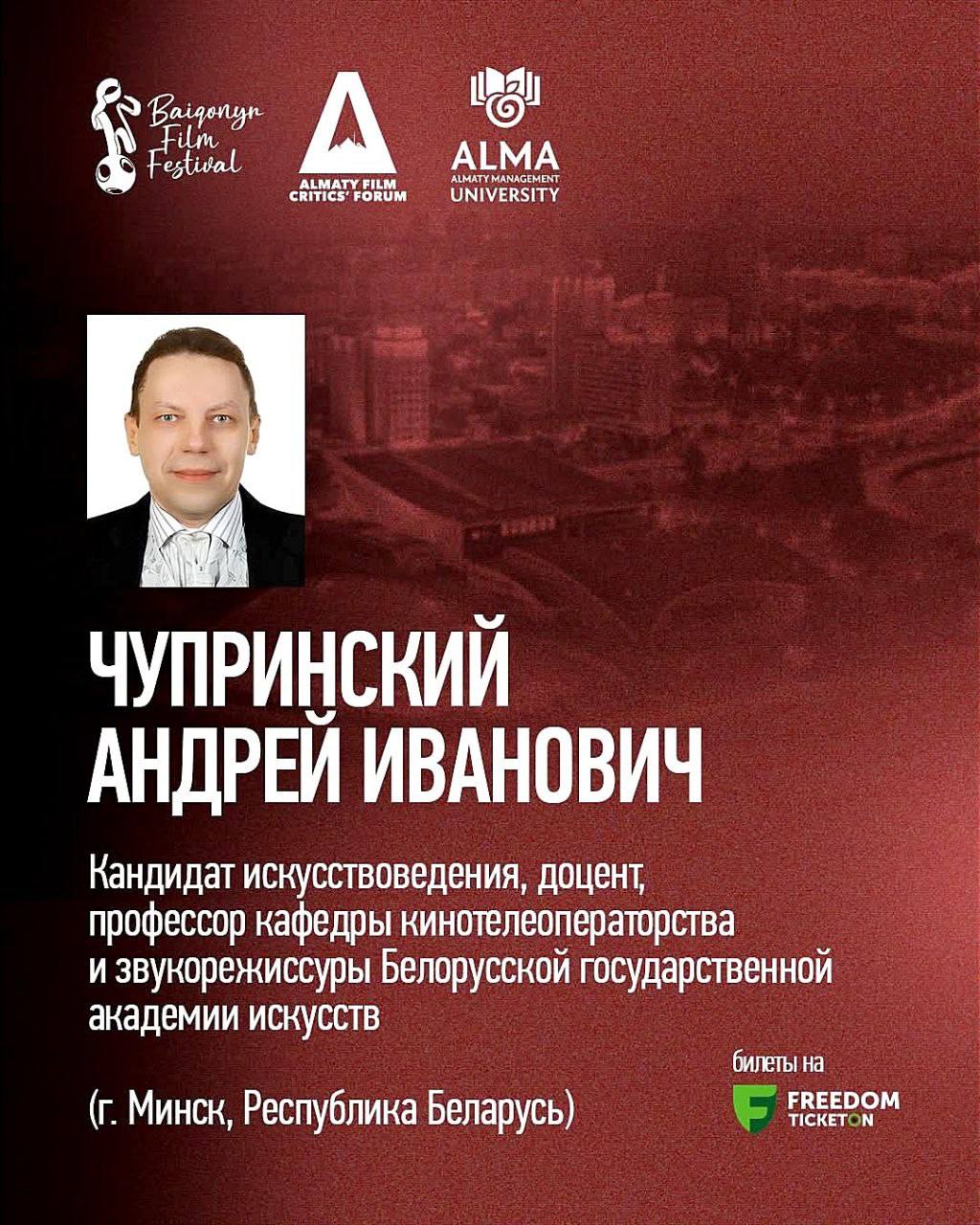 На нем Республику Беларусь, с популяризацией белорусской киношколы и научной презентацией монографии «Экология экранных искусств», будет представлять кандидат искусствоведения, доцент, профессор кафедры кинотелеоператорства и звукорежиссуры факультета кино, театра и телевидения учреждения образования «Белорусская государственная академия искусств», член Республиканского общественного объединения «Белорусский союз кинематографистов» Андрей Иванович Чупринский.