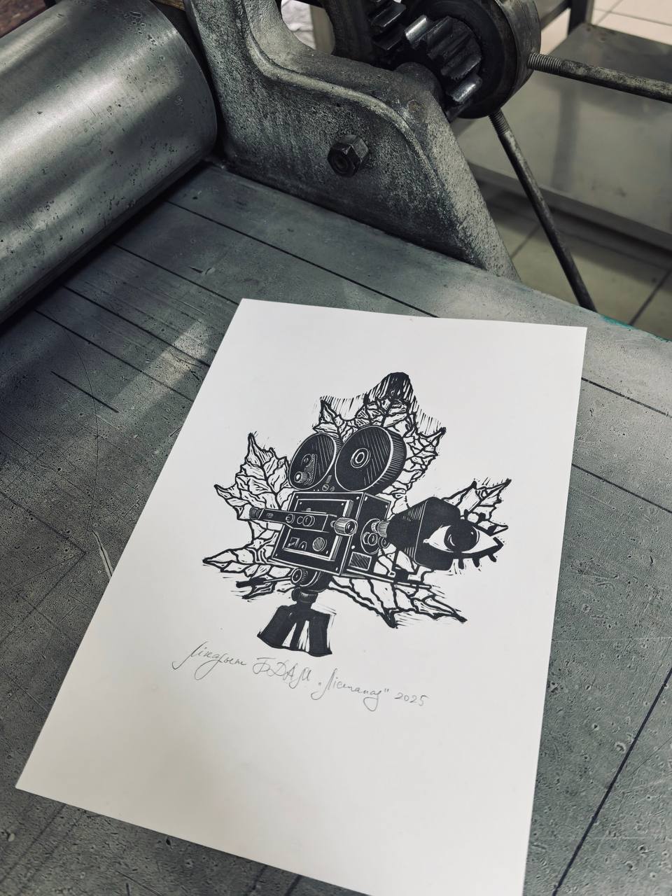 На подготовленную матрицу (клише из линолеума) участникам было предложено раскатать типографскую или специальную краску для линогравюры с помощью валика. Клише прикладывалось к листу бумаги и прижималось с помощью печатного пресса.