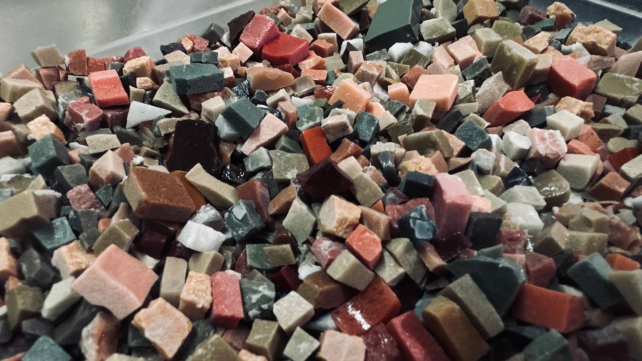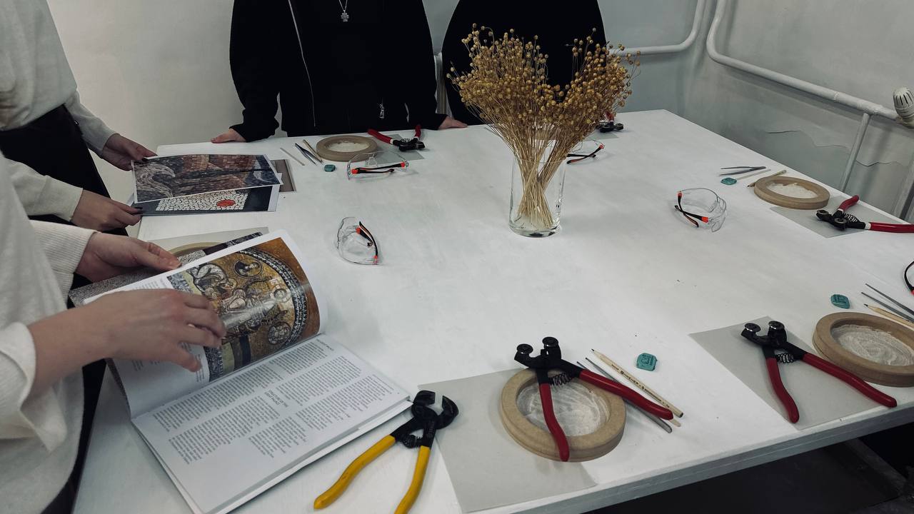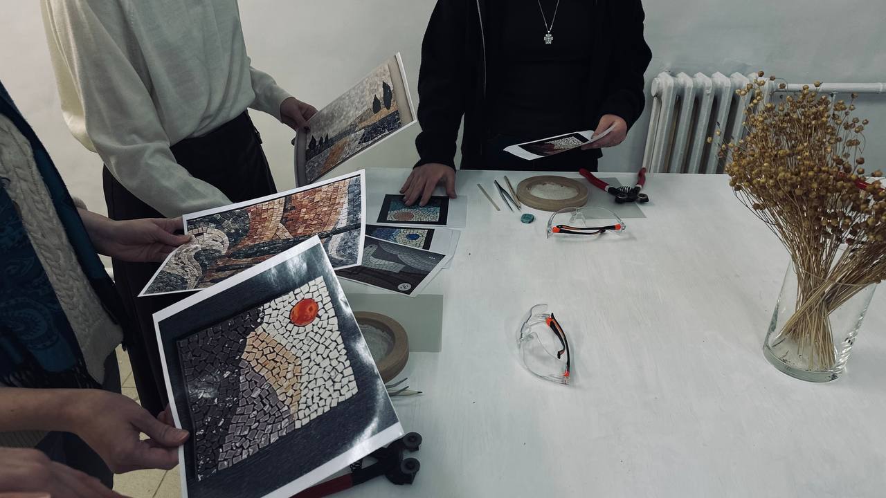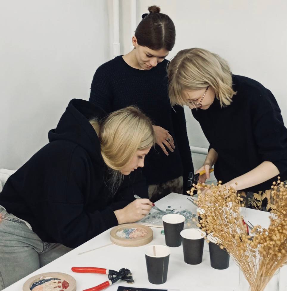 Для участников были заранее подготовлены рабочие места, разложены материалы и инструменты — мозаичная плитка разных цветов, клей, кусачки, стилусы и основа для будущей картины.