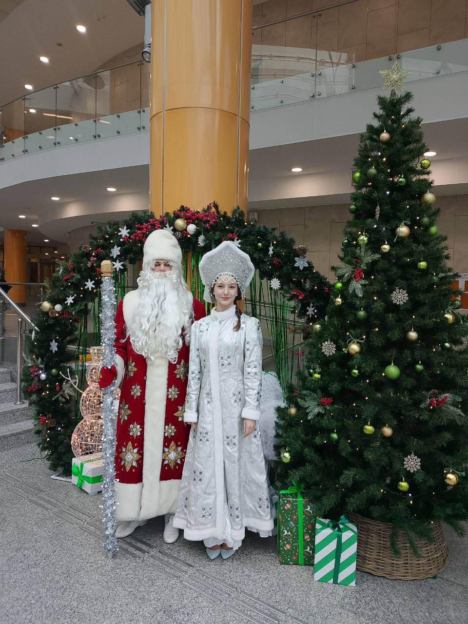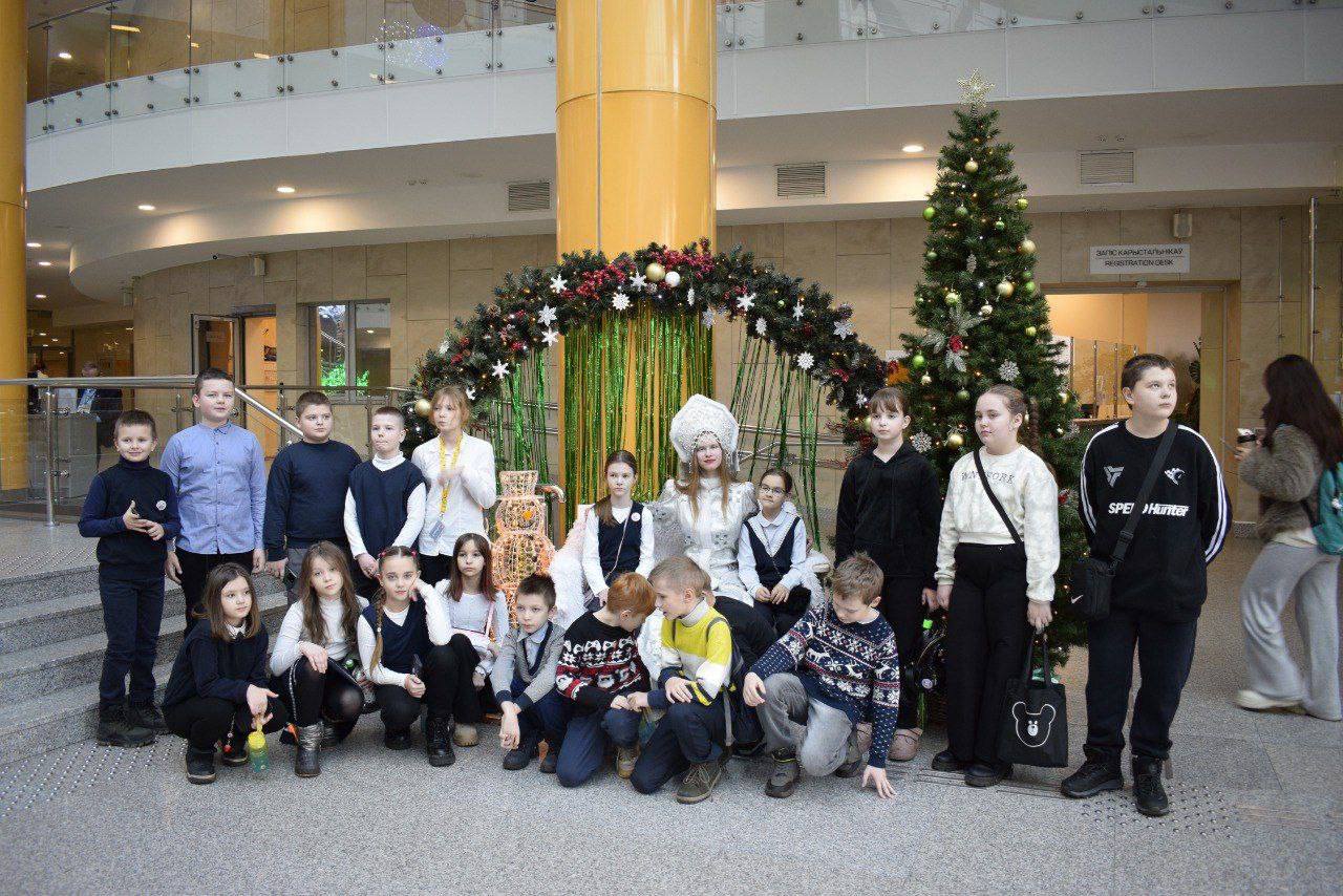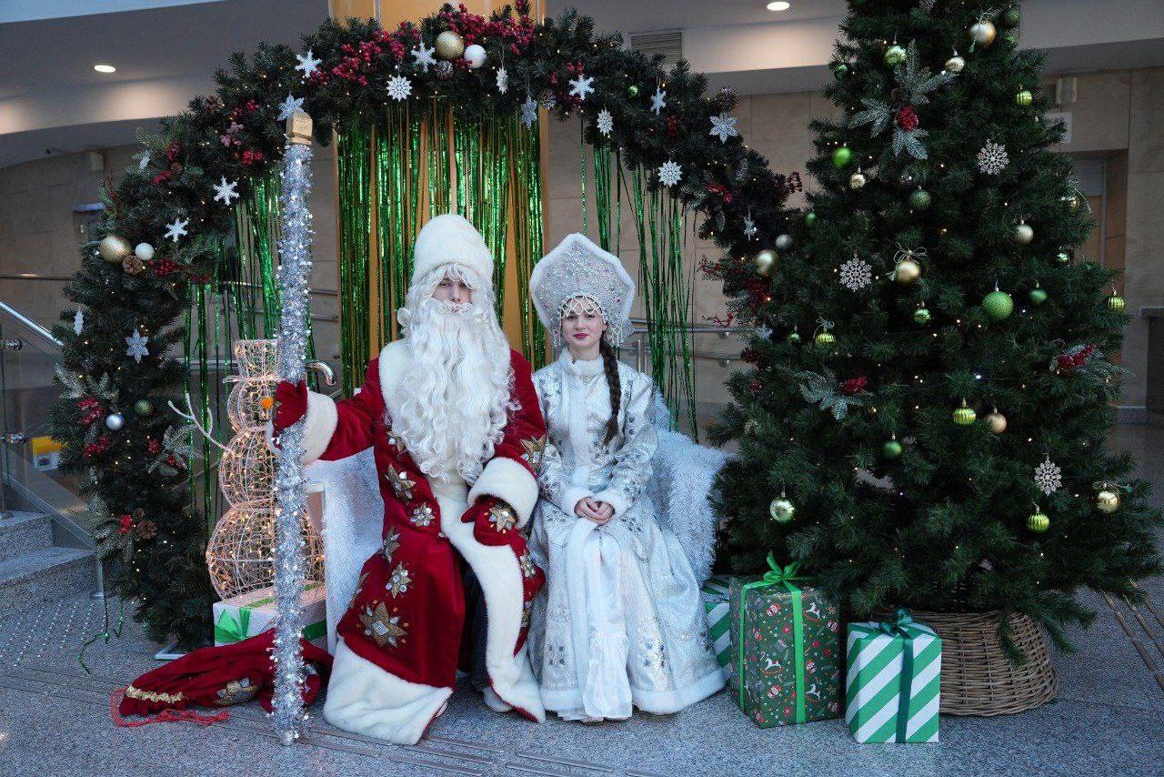 Гостей библиотеки встречают Дед Мороз и Снегурочка — участники студенческого отряда — студенты ФКТиТ, которые проводят для них экскурсии, фотографируются и, конечно, исполняют самые заветные желания!