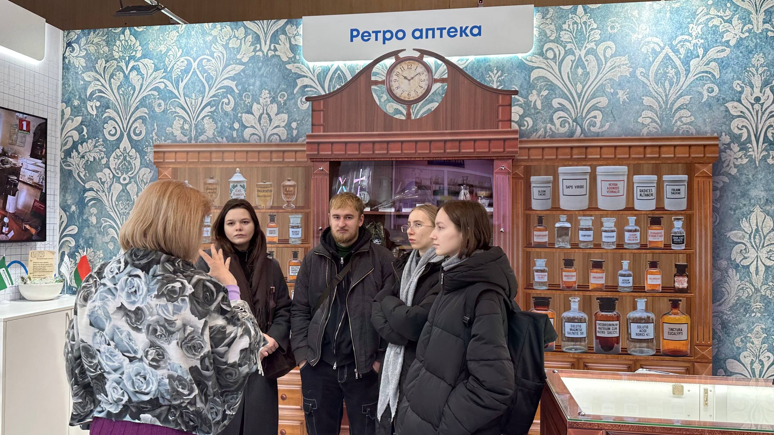 Не менее важным является и стенд «Ретро аптека», позволяющий окунуться в атмосферу интерьера исторической аптеки в Троицком предместье Минска. На стенах аптеки каждый посетитель может увидеть уникальные расписные плитки, созданные заведующим кафедрой декоративно-прикладного искусства и костюма БГАИ, доцентом Александрой Дятловой!