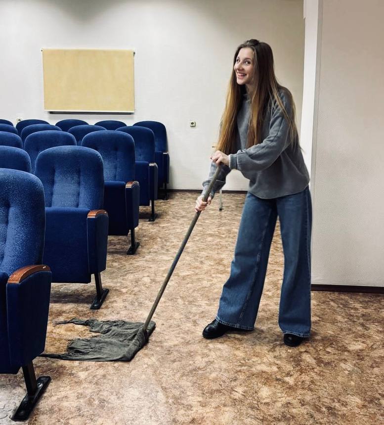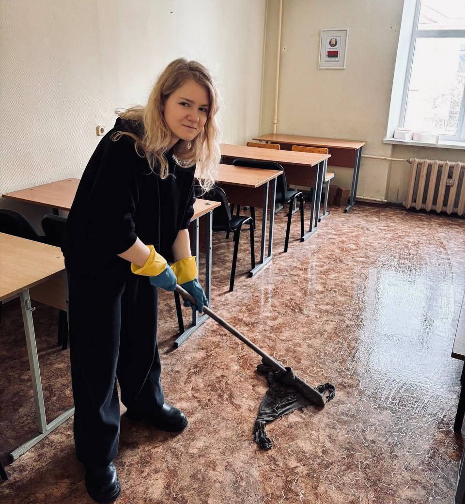 Ребята помогают в уборке территории, прилегающей к корпусу, а также наводят порядок в учебных аудиториях.